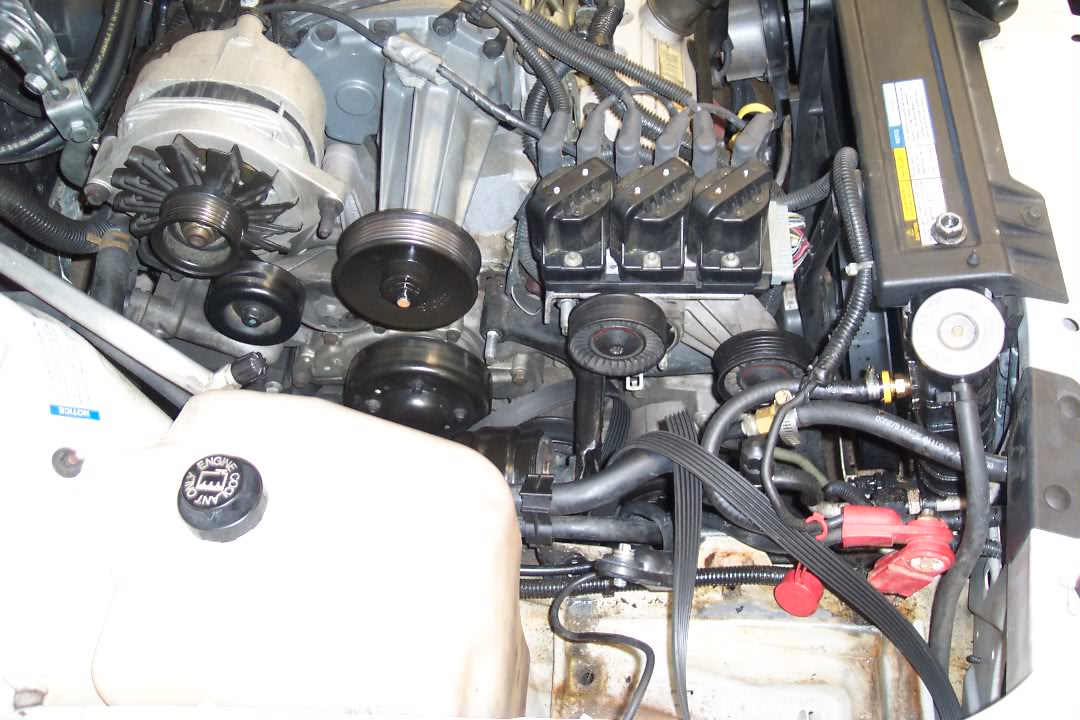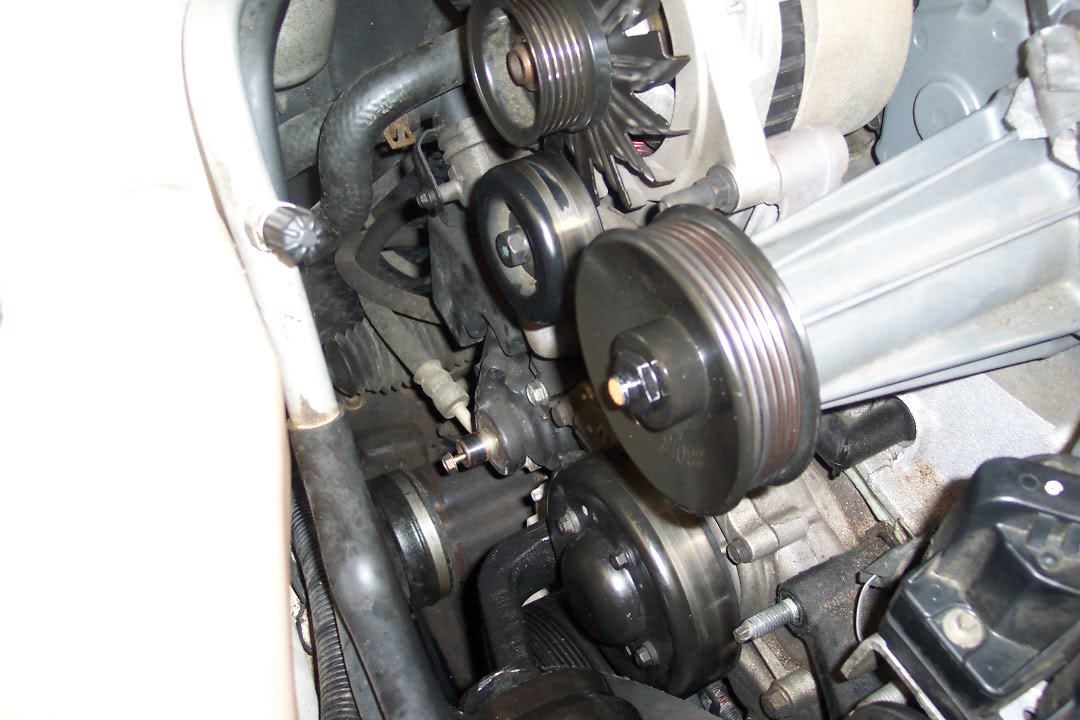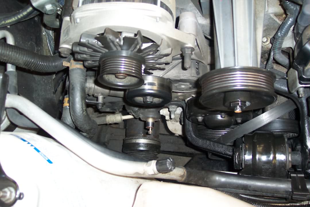Bill could not be more righ :bcrazy: Yes, the PS pulley does need to be removed. The third leg of the bracket sits behind it :roll: Attachment 63383 Attachment 63384 Attachment 63385 Attachment 63386 Attachment 63387 Attachment 63388 Attachment 63389 Attachment 63390 Attachment 63391 Its a 4 hr job. Have plenty of beer and patience. And again, Bill makes a great point change all pulleys at once. The frist one for the blower that sits right in the bracket--seems go go out more than the other ones. |