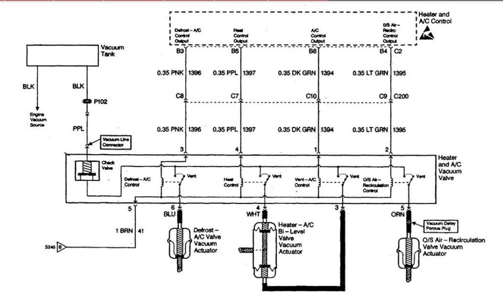 Attached a jumper line from where the purple vacuum tube is connected to the orange splice by the top of the programmer box, to the male nipple that corresponds to the purple line on the programmer box, I also attached 4 clear plastic tubes to the other male nipples (GREEN, WHITE, ORANGE, BLUE) which are the same color and position on the clear plastic harness, I started the car with the control panel (head) in the off position, I got vacuum to the white#4 nipple, I turned the air flow button to FLOOR,MID and got vacuum to the blue #6 nipple, I then switched to the Mid air flow and got vacuum to the blue#6 and green#3 nipple, I switched to the FLOOR air flow and got vacuum to the white nipple #4 But had air to the defroster, I switched to WINDSHIELD FLOOR air flow and got NO vacuum at any tube but had air to the floor and windshield