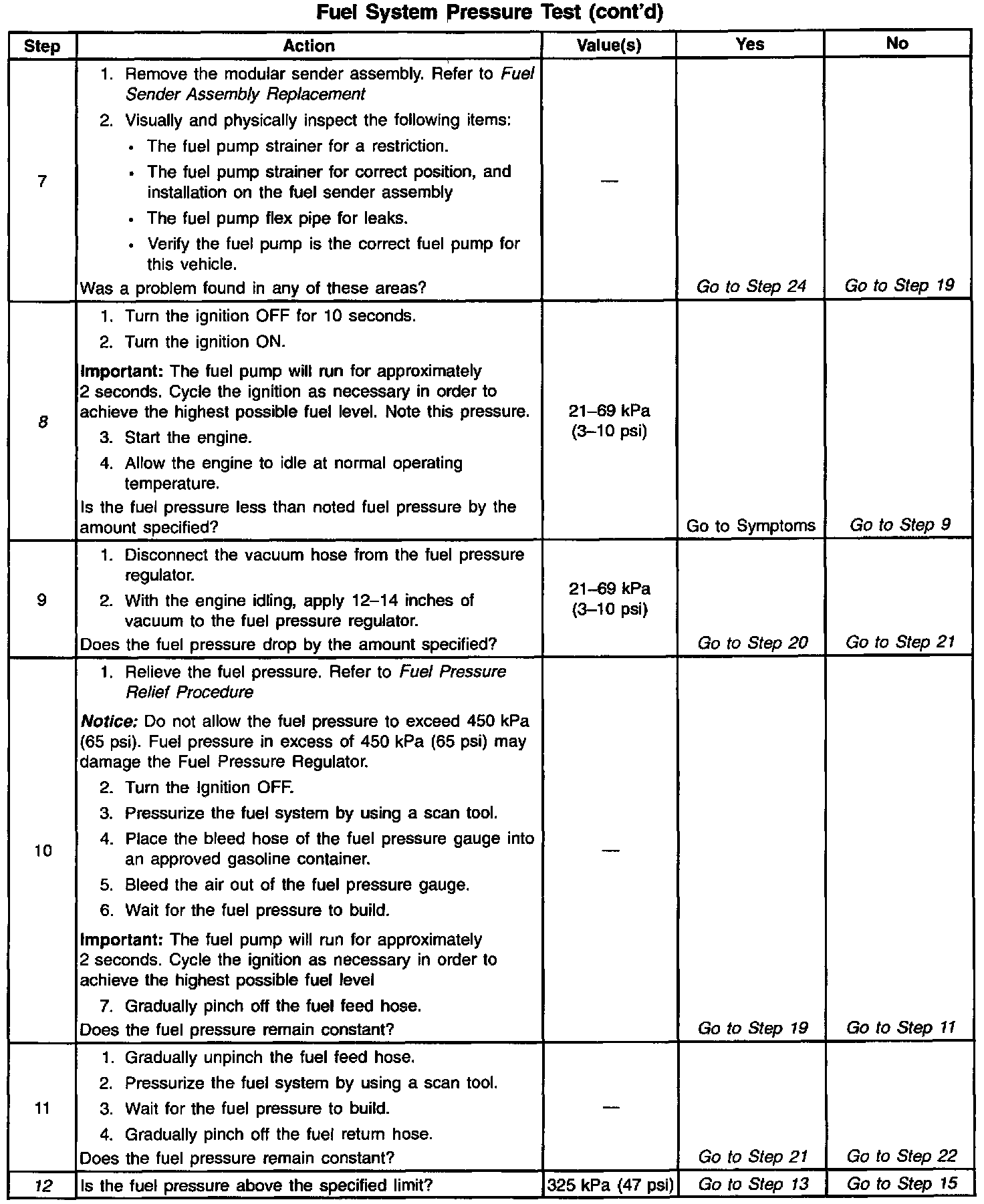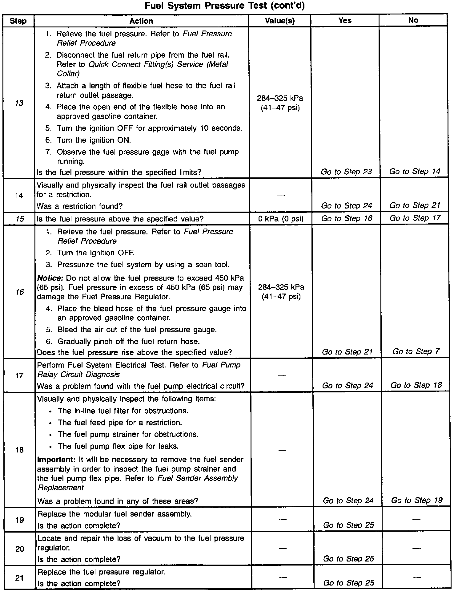 13. This test determines if the high fuel pressure is due to a restricted fuel return pipe or if the high fuel pressure is due to a faulty fuel pressure regulator.