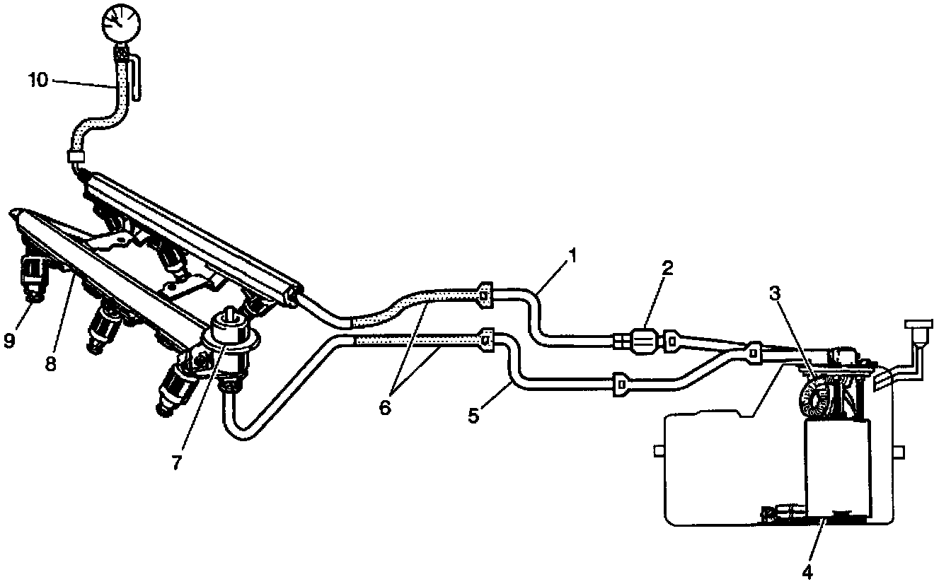 . The fuel pump is designed to provide fuel at a pressure above the pressure needed by the fuel injectors (9). A fuel pressure regulator (7), attached to the Fuel Rail, keeps the fuel available to the fuel injectors at a regulated pressure. Unused fuel is returned to the fuel tank by a separate fuel return pipe (5). The fuel pump flex pipe (3) functions as a conduit for transporting pressurized fuel from the fuel pump to the above cover fuel feed pipe. The fuel pump flex pipe also eliminates fuel pump generated pressure pulse noise, and eliminates clamps formerly needed for rubber hoses or nylon pipes. The fuel pressure gauge J34730-1A (10). The fuel pipe return and feed hose assemblies are the pinch points used during the fuel system pressure test (6).