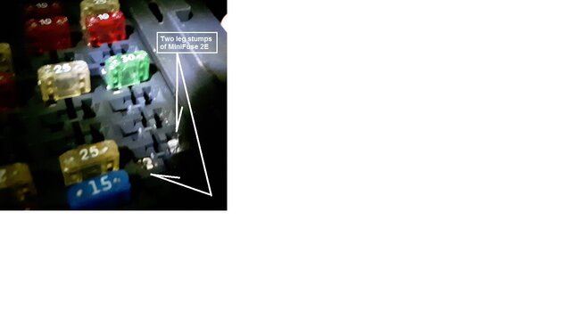 This suggests I can insert another fuse, and successfully start the engine, which seems preferable to butchering the MiniFuse panel to remove the mysterious metal stumps I'll let you know what happens.