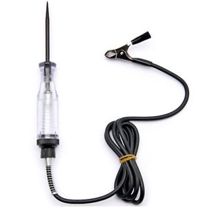 This is a test light with an alligator clip on one end of the wire, and a pointed probe on the other - which contains a small lamp that resembles an automotive glass fuse. It is not self-powered. The lamp did not light in any of the jumped combinations I mentioned earlier. The test light has a test voltage rating of 6v minimum.