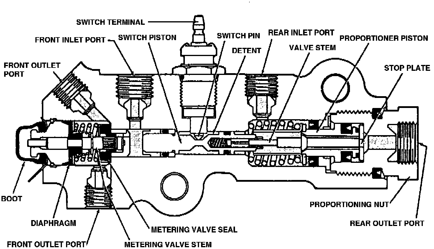 The metering valve delays front disc braking until the rear drum brake shoes contact the drum. The failure warning switch is actuated in event of front or rear brake system failure, in turn activating a dash warning lamp. The proportioner balances front to rear braking action during rapid deceleration.