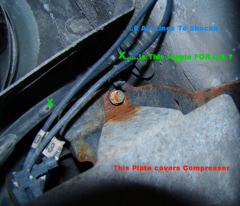You are correct on the air ride, only the rear has it, a tip I got from a friend on that system, every time you change your oil it would be good to take a little machine oil and lubricate the compressor, look under the upper right rear of your car and see if you see something that looks like this., ignore what I circled in red, see the T fitting at the lower nipple on the compressor,, you want to remove the hose from the nipple, or just remove the hose that goes from the T to the lower nipple, and drop just a couple of drops in there, it should prolong the life of the compressor.
