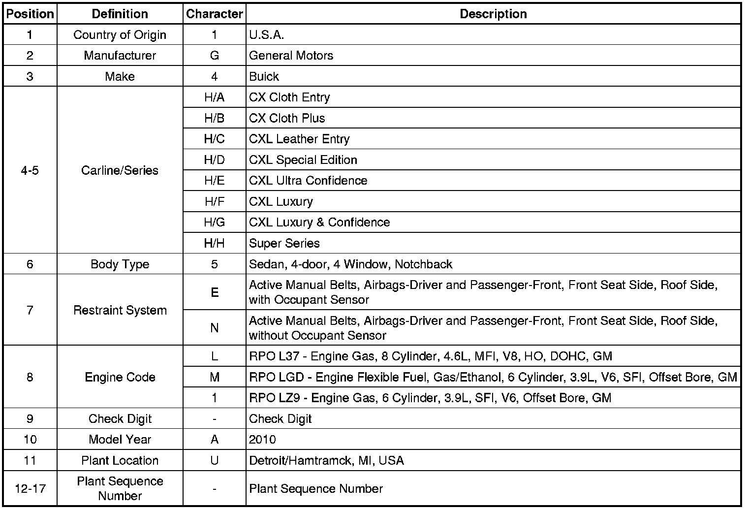 Home >> Buick >> 2010 >> Lucerne V6-3.9L >> Repair and Diagnosis >> Application and ID >> Vehicle, Engine, Transmission ID and VIN Location, Derivative and Usage