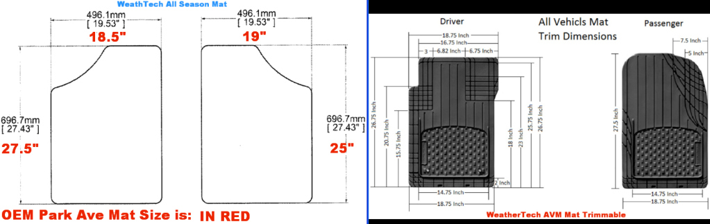 They sent me the dimensions for the all season mat and for the new AVM or all vehicle mat that can be cut to fit. So..I am going to have to take the OEM carpet mats out, measure them and see where I stand. Not pleased at all.