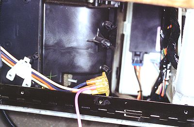 1. Release and fully open the glove box. Remove any screws holding the liner in place. This will expose the air conditioning programmer and multi color vacuum hose harness assembly. The vacuum source hose from the engine is black and connects to a violet flexible plastic tube going to the programmer vacuum connector plug.