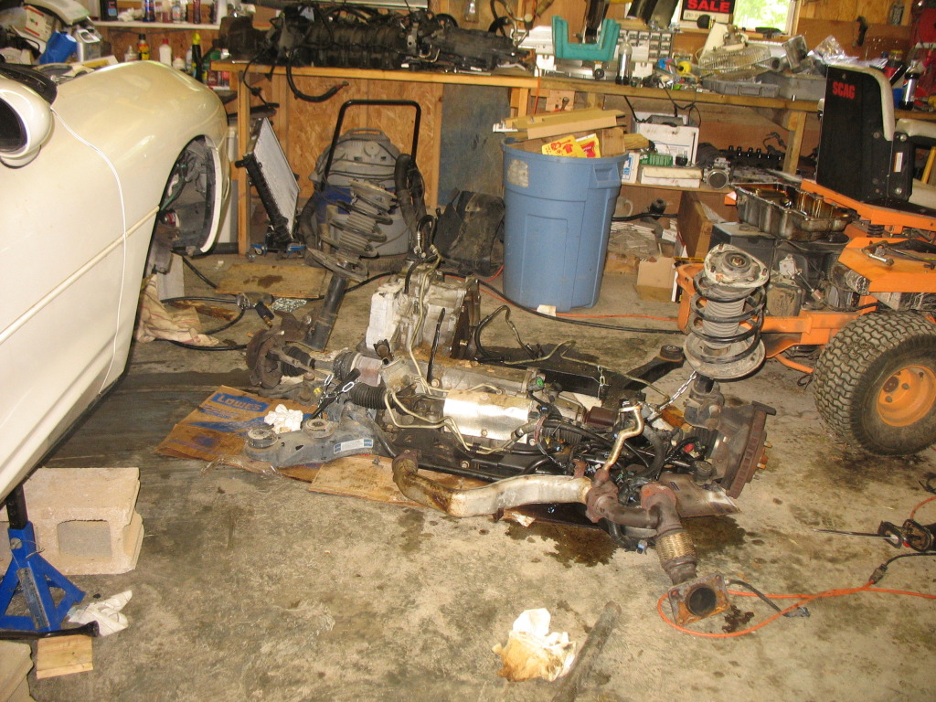 the car lifted up and engine and trans about to be pulled out