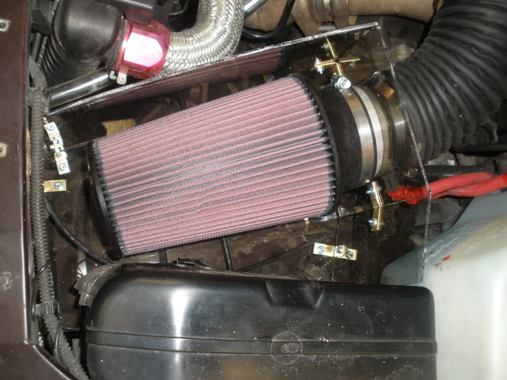 Then move on to the side. Watch for clearance of wires, hoses, and hood release. This shows the cone filter placement.