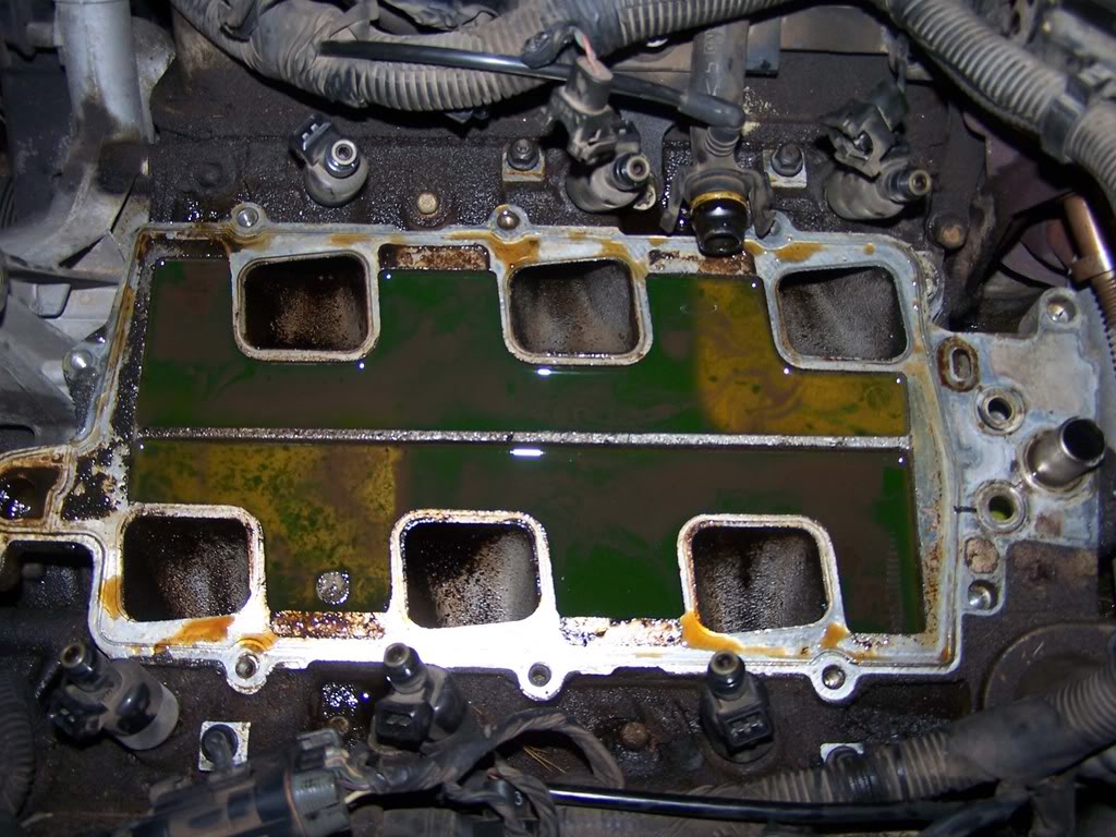 I am starting to tear the top end off this thing and when I removed the air box I found a "liquid" on the air box and on the airfilter and in the ribbed tube from the TB to the Air box. There is enough in the air tube to fill a shot glass. It is black and runny (Oil and Antifreeze??????). When you get it on your fingers it feels sorta slimey and leaves my fingers black like a thin layer of grease. Could there be more wrong than just lim and uim gskts, and plenum??