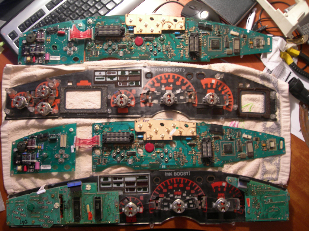 So I finally got up the nerve to remove the instrument panel and investigate why all of my gauges except the speedometer and tach were dropping out. After removal and careful inspection and cleaning I was able to revive it if I rapped the dash so I went to Ebay and found a replacement cluster. The installation went smooth except that in my research I failed to notice that the eprom on the back of the cluster has to be swapped in order to maintain the mileage information. I think I'll save that for another day since everything is all back together. The cluster works perfectly. I had the option of having it repaired but the local shop wanted almost $300.00. I may go through the old board and resolder all of the connections but there is no hurry at this point. So for anyone who like me sat on the fence for over a year worrying about cosmetic damage or broken clips before attempting this repair here are some of my observations.